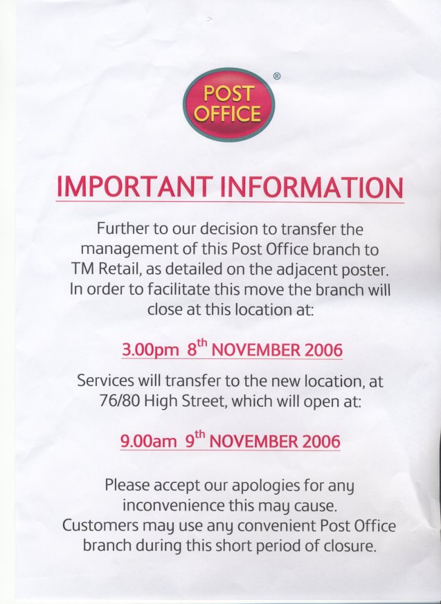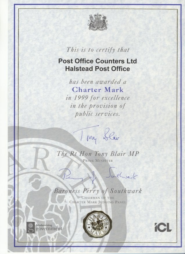 Essex during January 2007. The Halstead team won many prestigious awards for their excellent work, including achieving a Chartermark for outstanding Customer Service and coming second in national competitions to find the Best Post Office. You can see some of their awards and trophies in the Museum. At 3.10pm the two Post Office lozenges were removed and recovered by a team from the Museum. One will stay in Halstead whilst the other will form part of a centrepiece postal display in Alan Mattin's collection near